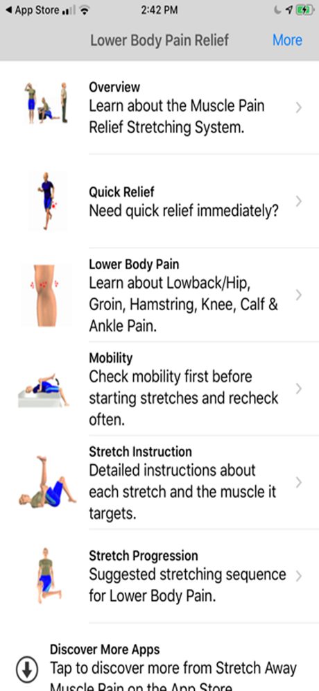 La plupart des douleurs musculaires sont dues à des muscles raccourcis. L’étirement est l’un des plus importants activités que vous pouvez faire pour votre corps. L’étirement augmente la plage articulaire perdue de mouvement et de mobilité musculaire, pour aider à réduire la douleur et à améliorer la posture. Le système d’étirement pour soulager les douleurs musculaires est unique ; Cibler les muscles qui causent directement ou indirectement la plupart des douleurs musculaires. Les animations avancées avec des routines suggérées sont conçues pour augmenter compréhension de ces exercices d’inspiration orthopédique qui sont sûrs et efficaces.