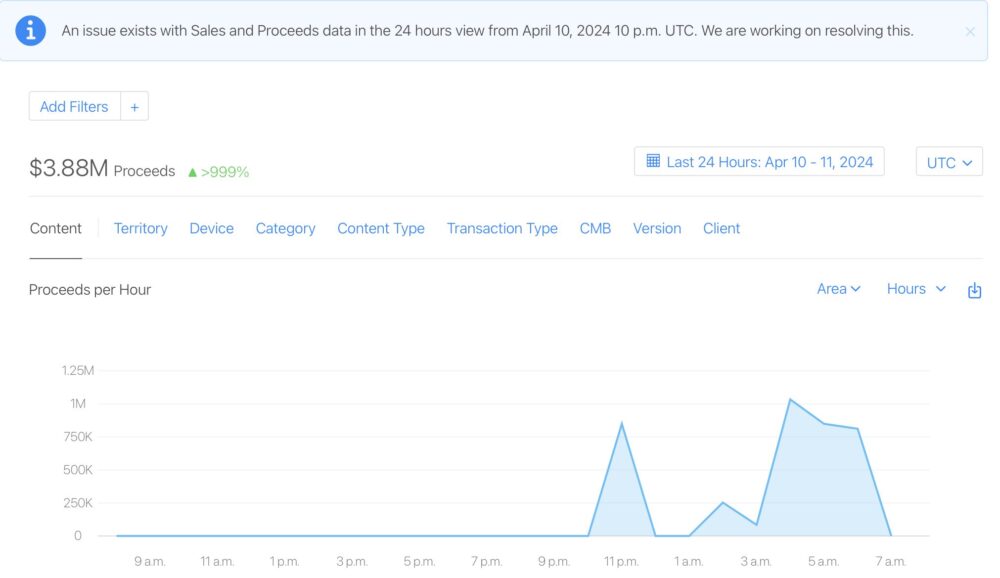 C’est ainsi qu’un bug perturbe la transmission précise des données et donne aux développeurs l’impression que leurs applications ont généré des millions d’euros. En effet, plusieurs développeurs sur Mastodon notent des inexactitudes flagrantes dans les données concernant les ventes et les recettes de leurs applications. Ils observent des pics significatifs sur plusieurs heures lorsqu’ils examinent les données sur une période de 24 heures.