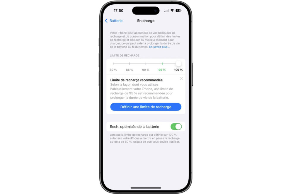 « Selon la façon dont vous utilisez habituellement votre iPhone, une limite de recharge de 95 % est recommandée pour prolonger la durée de vie de la batterie. »