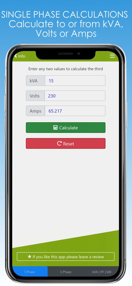 Application de calcul kVA pour iPhone et iPad. Calculez ou convertissez vers et depuis les kVA, kW, ampères, volts et facteur de puissance en utilisant les autres valeurs électriques connues avec des calculs de kVA monophasés et triphasés.