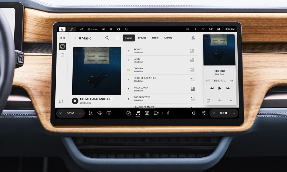 Désormais, les voitures électriques de la marque Rivian (tels que le modèle R1T et le R1S) supportent Apple Music (le service de streaming musical d’Apple). Ce support inclut également l’audio spatial avec le Dolby Atmos.