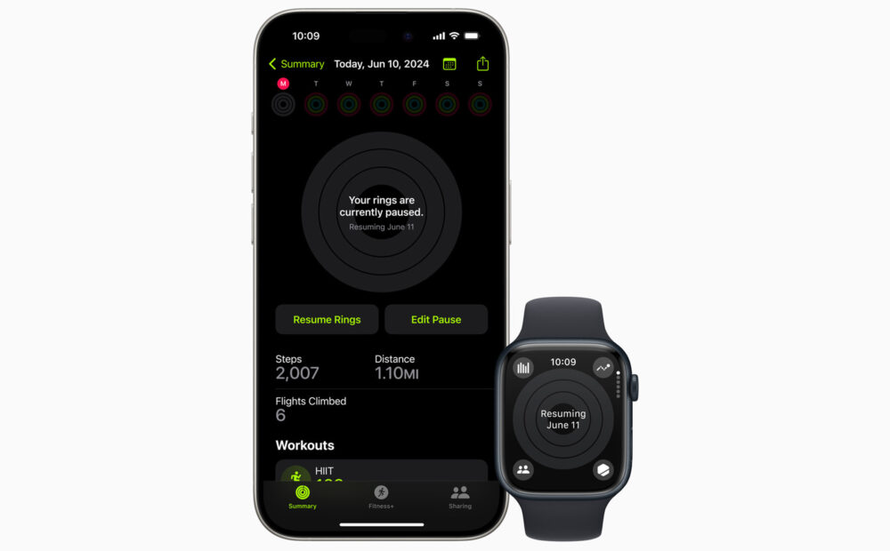Les anneaux Bouger, M’entraîner et Me lever indiquent votre activité quotidienne et l’objectif est de les fermer chaque jour. Mais si vous avez besoin de faire une pause, vous pouvez désormais mettre vos anneaux en pause pendant une journée, une semaine, un mois ou plus et poursuivre votre série de récompenses.