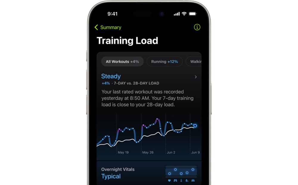 La charge d’entraînement vous permet d’évaluer l’impact de l’intensité de vos séances sur votre corps au fil du temps. Cela vous donne les informations nécessaires pour ajuster vos entraînements de manière éclairée, notamment lorsque vous vous préparez pour un événement important. De plus, vous pouvez accéder à vos signes vitaux nocturnes pour obtenir des données supplémentaires. Consultez votre charge d’entraînement via l’application Activité.