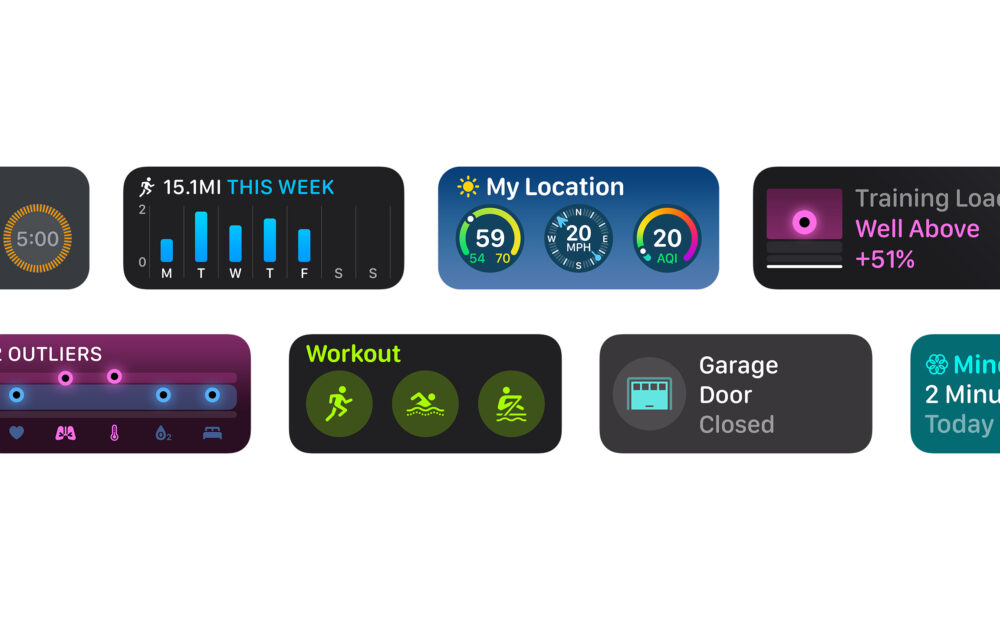 Les tout nouveaux widgets incluent des alertes de temps violent, la charge d’entraînement, les photos, la distance et Shazam. Et vous pouvez accéder directement aux trois éléments que vous avez utilisés le plus récemment dans une application, comme vos trois types d’entraînement les plus récents ou les chansons que vous avez écoutées.
