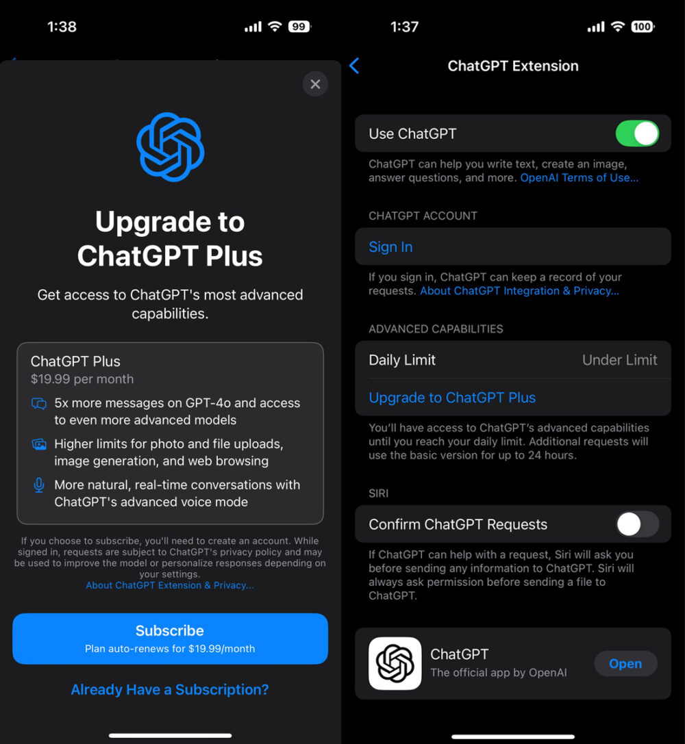 ChatGPT Plus et les limites journalières sur iOS 18.2