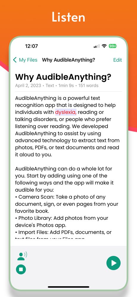 AudibleAnything est une application de synthèse vocale de premier plan. AudibleAnything permet aux personnes atteintes de dyslexie et d’autres troubles de la lecture et de la parole dans le monde entier de convertir n’importe quel texte à partir d’images, de PDF et de documents en audio. En quelques clics, vous pouvez capturer une image ou sélectionner un fichier sur votre téléphone, et notre technologie avancée de reconnaissance de texte convertira automatiquement le texte en audio de haute qualité que vous pourrez écouter en déplacement.