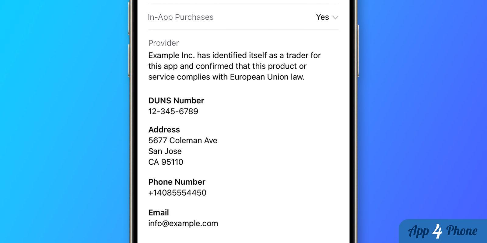 Pour les développeurs individuels, l’App Store européen affichera leur adresse ou boîte postale, leur numéro de téléphone et leur adresse e-mail. Pour les organisations, seules le numéro de téléphone et l’adresse e-mail sont requis. Ces informations seront disponibles sur la page de chaque application dans l’App Store.