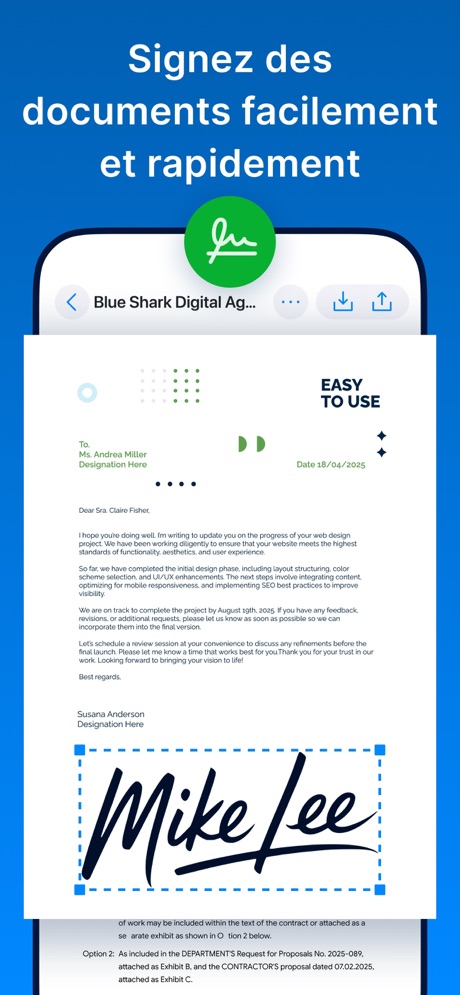 Sign est un outil simple et puissant conçu pour une signature numérique rapide et sans stress. Que vous approuviez des contrats, confirmiez des accords ou autorisiez tout autre fichier, cette application vous offre un moyen sûr et fiable de tout gérer depuis votre appareil. Grâce à ses fonctionnalités modernes et à son interface épurée, eSign garantit un processus de signature fluide et sans effort.