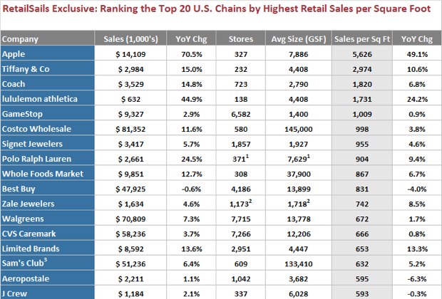 En effet, plus de 5 626 ventes sont réalisées par pied carré dans un Apple Store. Ce qui place les magasins en pôle position devant Tiffany & Co et Coach. Pour voir le classement entier, c’est juste ci-dessous.