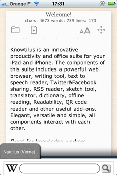 Vous pouvez faire une recherche dans vos signets ou bien avec des mots clés dans Google en utilisant directement la barre d’URL de l’app, accessible grâce à l’icône « Globe » en bas à gauche. De plus, en sélectionnant un mot et en cliquant sur « Knowtilus » après avoir tapé dessus, vous ouvrirez un menu vous permettant d’accéder à l’icône « Search » qui offre une recherche de ce mot sur Wikipédia, Google ou encore Yahoo.