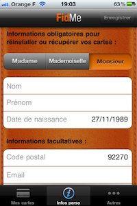 Un onglet « Infos Perso » est disponible, il vous permet de récupérer toutes vos cartes de fidélités en cas de changement d’iPhone par exemple. il vous suffira de rentrer vos données personnelles.