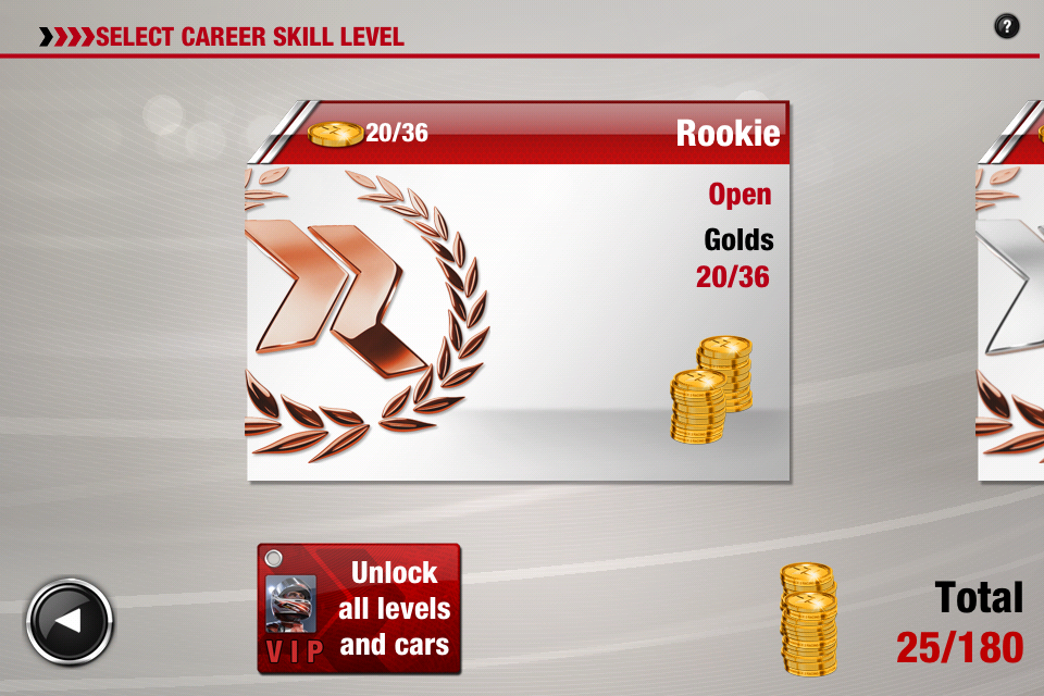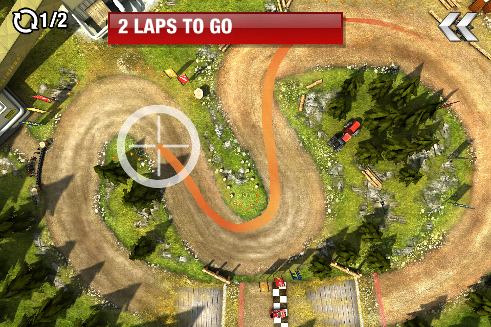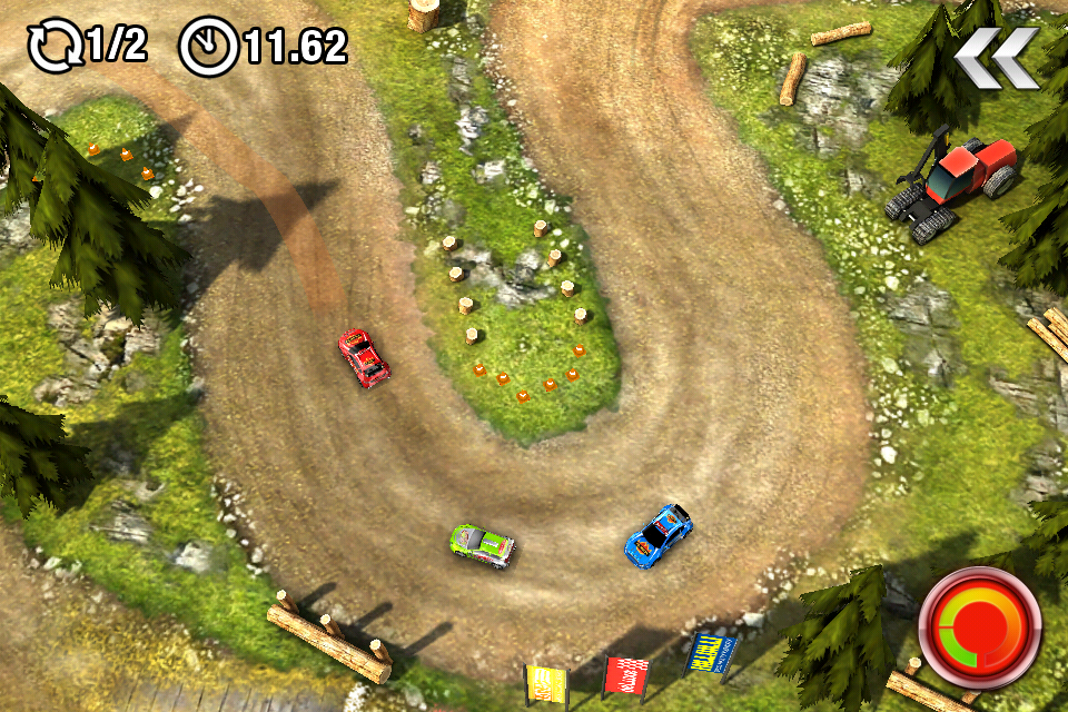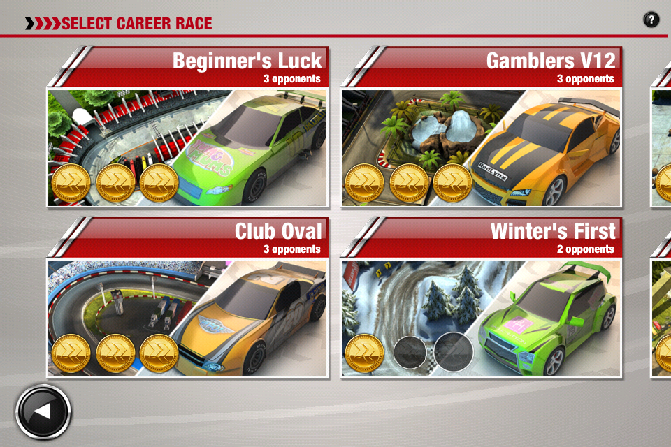 Vous avez tout d’abord le choix de votre niveau (rookie, talent, pro, champion, elite) et ensuite le choix du circuit dans lequel vous allez être confronté à tout d’abord 1, puis 2 et enfin 3 adversaires afin de remporter les 3 médailles d’or par circuit et ainsi débloquer de nouvelles voitures et circuits. Pour ceux qui ne connaitraient pas le principe du jeu, une petite explication s’impose. Au lieu de conduire les voitures, il faut tout d’abord tracer la trajectoire de la voiture sur le circuit avec votre doigt puis la course se déroule sans interaction mis à part un petit « turbo » que vous pouvez activer.
