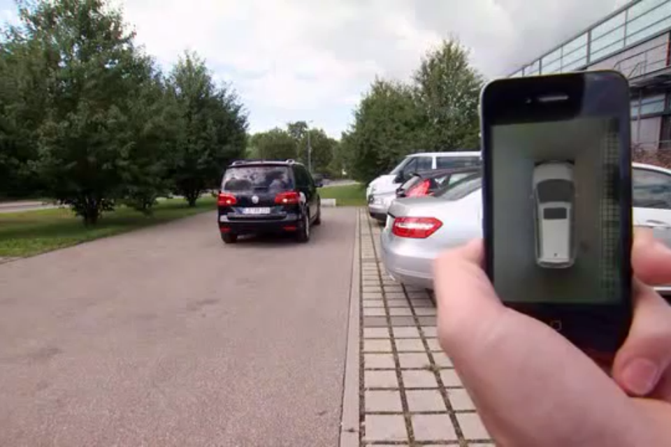 En effet, la voiture est donc capable de détecter un emplacement assez grand grâce à de nombreux capteurs mais le système actuel vous impose de rester dans la voiture afin de donner les coups de freins nécessaires en cas de danger. Le nouveau système, lui, vous permet de sortir de la voiture afin de gérer votre créneau de l’extérieur et interagir via votre iphone comme voici: