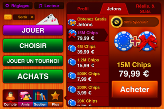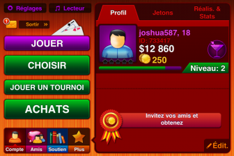 Donc dans cet onglet, il y a trois sous-onglets. Le sous-onglet profil vous donne le montant de votre stack et votre niveau qui augmente selon votre expérience grâce à des rubans ou des médailles obtenus selon votre temps d’inscription, le nombre de mains gagnés de suite, les combinaisons gagnantes, etc…; tout ceci est visible depuis le sous-onglet « Réalisations et statistiques » (en appuyant sur la coupe) qui dénombrent également le nombre de mains gagnées et jouées. Tandis que le sous-onglet « jetons » est toujours réservé à l’achat in-app de jetons.