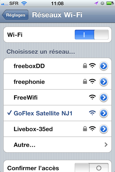 Avant toute chose, il faut aller dans la partie Réglages, Wi-Fi, et choisir GoFlex Satellite NJ1 sur votre iBidule pour pouvoir accéder au GoFlex Satellite.