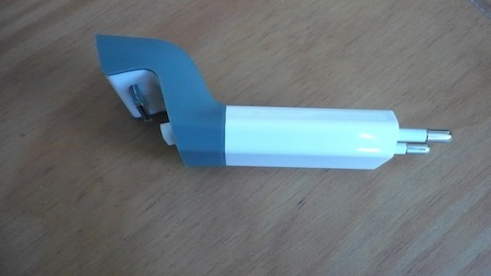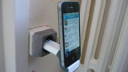 Je dois avouer que le MiniDock plus la « prise » m’a semblé être un ensemble un peu long, et donc je craignais que le poids de l’iPhone ne fasse tomber l’ensemble. Eh bien non ! Tout reste bien dans la prise.