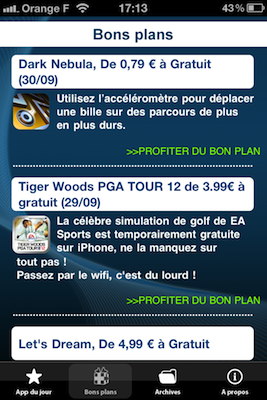 L’application possède également une section bons plans qui vous permettra de consulter les apps en promotion (en complément de celles proposées par App4Phone bien sûr 😉 ).