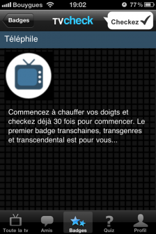 Une fois dans l’onglet « Badges », vous retrouvez donc toutes les possibilités pour ajouter des points à votre bagage. L’exemple ci-dessus nous propose donc de réaliser 30 checks pour obtenir le badge Téléphile, qui doit être permanent au contraire des badges Cougar Town ou Chut !.