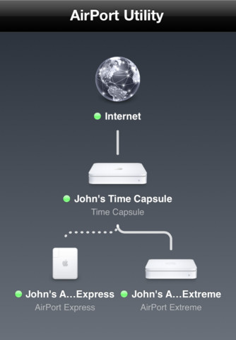 La première est l’équivalent de l’utilitaire AirPort que nous connaissons déjà sur Mac. Il permet donc d’administrer vos bornes AirPort ExPress, AirPort Extreme, et Time Capsule. Mais également d’avoir une représentation graphique très claire des composants de votre réseau wifi.