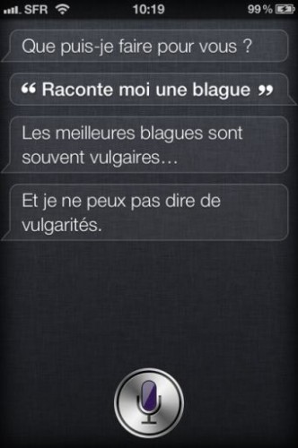 On voit que les équipes d’Apple ont pensé à tout et ont ajouté des répliques cachées. Par exemple : siri ne peut pas vous raconter une blague, car il n’est pas autorisé à parler grossièrement…