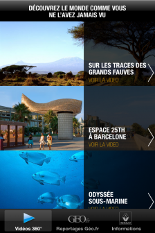 Nous voici donc sur l’écran d’accueil, qui nous propose 3 vidéos (à l’écran car 10 au total). Vous pouvez également remarquer les 3 différents onglets présents dans le bas de l’écran. Exceptionnellement, je laisserai de côté le premier onglet, ainsi que les vidéos, pour plus tard. Intéressons nous donc à l’onglet « Géo.fr » tout de suite. L’écran se présente de la même façon, en nous proposant cette fois 10 reportages différents, composé de trois articles par thème comme ceci: