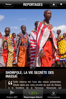 L’article se présente donc de cette façon: une superbe photo dans le haut de l’écran (un petit glissé vers la gauche et 2 autres photos se dévoileront) ainsi qu’un article complet dans le bas de l’écran. Pour afficher les 2 autres articles, il vous suffira d’utiliser les deux flèches en haut à droite. Je vous laisse la surprise des autres articles, j’ai choisi les Massaïs car j’aime cette culture tant en inadéquation avec notre temps.
