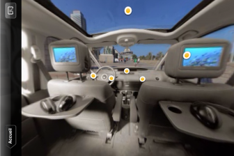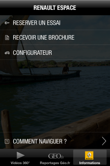 Cet onglet « Informations » est un grand classique du genre. Des liens directs sur le site de Renault pour, comme vous avez pu le voir, réserver un essai, recevoir une brochure ou accéder au configurateur (en gros, toute la gamme Renault dans un catalogue virtuel). Je ne m’attarderai donc pas sur cet onglet tellement je suis pressé de vous faire découvrir le premier sur lequel j’ai flashé complètement. Quand vous allez sélectionner une vidéo, vous verrez en effet une vidéo mais à 360°! Je m’explique; grâce au gyroscope, vous serez comme transporté dans une Renault Espace de l’autre côté du monde. Vous pourrez donc vous retourner pour admirer les paysages par la lunette arrière ou placer votre iPhone au dessus de votre tête afin de voir ce qui se passe à travers le toit panoramique. Pour que l’explication précédente soit plus claire, rien ne vaut quelques photos bien senties histoire de se faire une véritable idée: