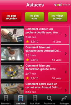 Regroupées en trois catégories, (les recettes, les astuces et les must), les vidéos sont classées selon les plus récentes, les plus vues ou les mieux notées, ce qui permet d’avoir un ensemble présenté de manière claire, au profit de la fluidité d’utilisation.