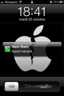 Mais voilà une nouvelle « faille » de sécurité pour tous ceux qui n’ont pas confiance à leur entourage ou qui ne veulent pas que leur portable puisse être utilisé en leur absence. Cette faille peut se révéler pratique (tout comme l’utilisation de Siri depuis le lockscreen). En effet, lorsque vous avez un appel manqué, le centre de notification vous le fait apparaitre sur le lockscreen bien évidemment. Mais si une personne mal intentionnée veut rappeler la personne en question lorsque vous êtes absent, cela lui est possible en faisant glisser l’icône du téléphone de gauche à droite sans même avoir à taper le code comme ceci:
