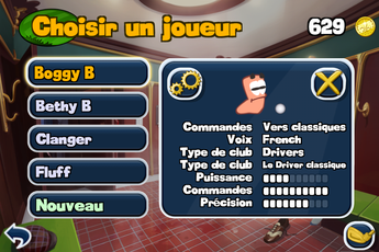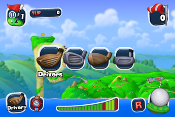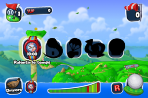 L’écran de jeu est plutôt clair: vous retrouvez dans « drivers » les différents clubs de golf disponibles, mais aussi vos pouvoirs spéciaux (balle parachute, capacité à ralentir le temps…) grâce à l’icône « montre » située à côté.