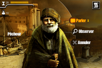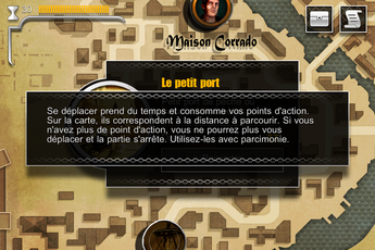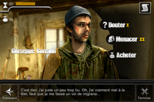 Ce que j’ai beaucoup aimé dans cette application, c’est que tout est très simple et parfaitement expliqué. Vous serez guidé au début du jeu dans votre aventure, mais bien sûr la difficulté se corsera au fur et à mesure des chapitres. En fait, vous pouvez réaliser différentes actions (vous déplacer, parler aux personnages, les corrompre etc.) grâce à vos points d’action, visibles dans la partie supérieure gauche de l’écran. En-dessous, vous retrouverez votre argent qui vous sert à « acheter » les autres personnages lorsque vous leur parlez.