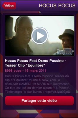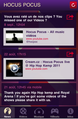 – News : pour suivre l’actualité du groupe (concerts, tournées, sortie d’album). Vous pouvez partager ces informations sur FaceBook, Twitter ou par Mail. Un lien vers YouTube d’une vidéo de démo de l’application est disponible.