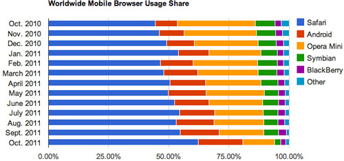 Safari, le navigateur -natif sur iPhone- est encore en pôle position… sur toutes plateformes confondues ! Plus de 60% des connexions internet mobile se font par l’intermédiaire de Safari !