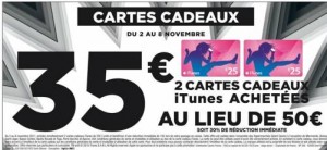 25+25 = 35 € ! Oui c’est possible avec Géant Casino qui sort sa promotion sur les cartes iTunes. Pour l’achat de deux cartes iTunes d’une valeur de 25€ unitaire, soit 50€… vous ne payerez que 35 € le tout, soit 15 € d’économisés !