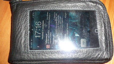 L’étui est en cuir doublé d’un tissu doux à l’intérieur, et la partie plastifiée permettant de voir l’écran permet également de l’utiliser, on peut donc taper un texte ou se servir de différentes applications sans enlever l’iPhone de cette housse.