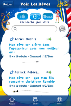 Le bouton « Voir les rêves » du menu principal vous permet bien évidemment d’accéder aux rêves des autres « rêveurs ». Vous pouvez effectuer une recherche si vous avez un rêve en tête, ou bien sélectionner quelques réglages pour mieux vous y retrouver.