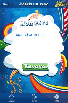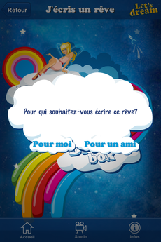 Les rêves préconçus vous offrent en réalité plusieurs possibilités. Vous choisissez le début d’un rêve, puis un autre sous-menu s’affiche pour que vous complétiez plus précisément votre rêve… De quoi vous aider si vous n’avez pas trop d’idées. A savoir que vous pouvez écrire un rêve pour vous, mais aussi pour vos amis (même ceux qui n’ont pas d’iPhone).