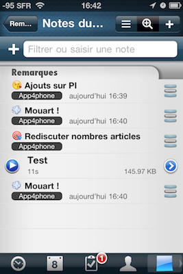Deuxième nouveauté : les « remarques », une sorte de gestion de notes, auxquelles on ajoute des tags, rangés par dossier. Et comme vous le voyez, il y a aussi des notes vocales !