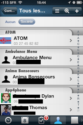 Et voici la grande nouveauté : le répertoire ! Enfin ! Bon, il s’agit évidemment d’une sorte d’alias du carnet d’adresses, mais l’avantage c’est que vous pouvez enfin trouver les coordonnées sans sortir de Pocket Informant, et ajouter un contact avec n’importe quel événement.