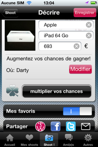 Ensuite c’est tout simple. Il vous suffit de cliquer sur Shoot, de prendre une photo du produit (au hasard un iPad de 64 Go), d’y renseigner sa marque, la référence produit et son prix. Un chargement après, vous êtes participant du concours et il vous suffira d’attendre la fin du tirage au sort afin de savoir si vous avez remporté votre précieux. Simple, innovant et super fun !