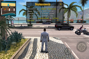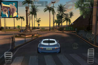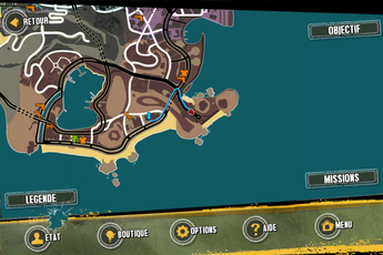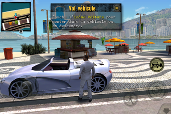 Parlons maintenant de la jouabilité du jeu. Eh bien j’ai réellement été agréablement surprise. En effet, je n’aime pas trop jouer aux jeux vidéos sur iPhone car ceux-ci s’avèrent souvent d’une jouabilité désastreuse. Pourtant, Gangstar Rio a su tirer parti de son gameplay. On retrouve donc un joystick virtuel en bas à gauche de l’écran pour déplacer le héros, ainsi que des boutons à droite pour tirer, s’accroupir, ou encore entrer dans une voiture par exemple (ceux-ci s’adaptant aux situations dans lesquelles vous vous trouvez). La conduite des voitures se fait via l’accéléromètre et deux pédales apparaissant à l’écran.