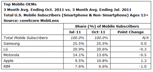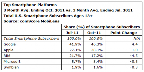 Selon une étude publiée par Comscore, qui mesure la tendance actuelle du marché du smartphone aux U.S.A, Android continuerait de caracoler en tête des ventes. Cette étude a été menée sur des utilisateurs d’au moins 13 ans, et sur une période de 3 mois ( de juillet à octobre 2011)
