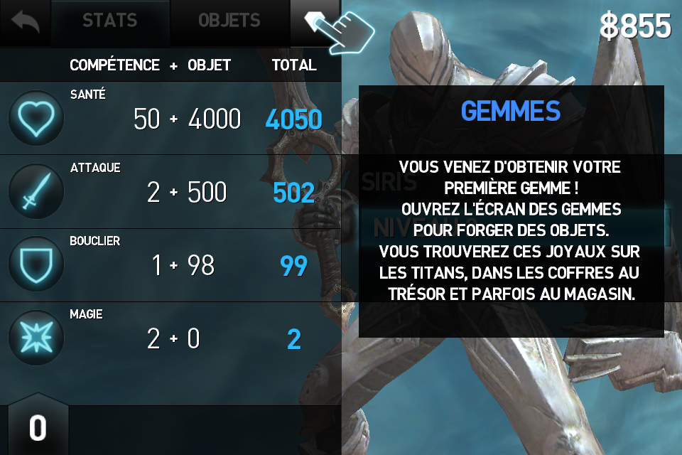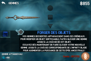 Enfin, dernière nouveauté: les gemmes. Celles-ci, qu’elles soient trouvées sur le terrain ou achetées, nous permettent d’améliorer l’équipement du héros en apportant différents bonus (magie, collecte d’or, santé…). Vous pourrez par exemple enchanter vos armes pour leur donner des « attaques aquatiques » ou autre.