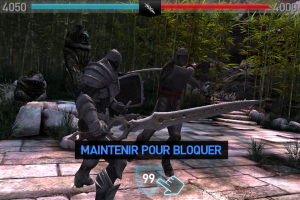 Pour ce qui est des graphismes, on ne peut être que satisfait. Encore une fois, le moteur Unreal Engine 3 fait des merveilles. On retrouve des décors magnifiques avec une qualité de détail jamais vue sur l’AppStore. Les personnes sont également magnifiques, leurs armes et armures étant d’une finition remarquable. Le jeu alternant entre combats et cinématiques, il y a effectivement de quoi en mettre plein la vue. Enfin, l’accompagnement sonore est parfaitement adapté. Les sons d’arme sont particulièrement réalistes, bref: tout est fait pour s’accorder à la perfection avec les graphismes.