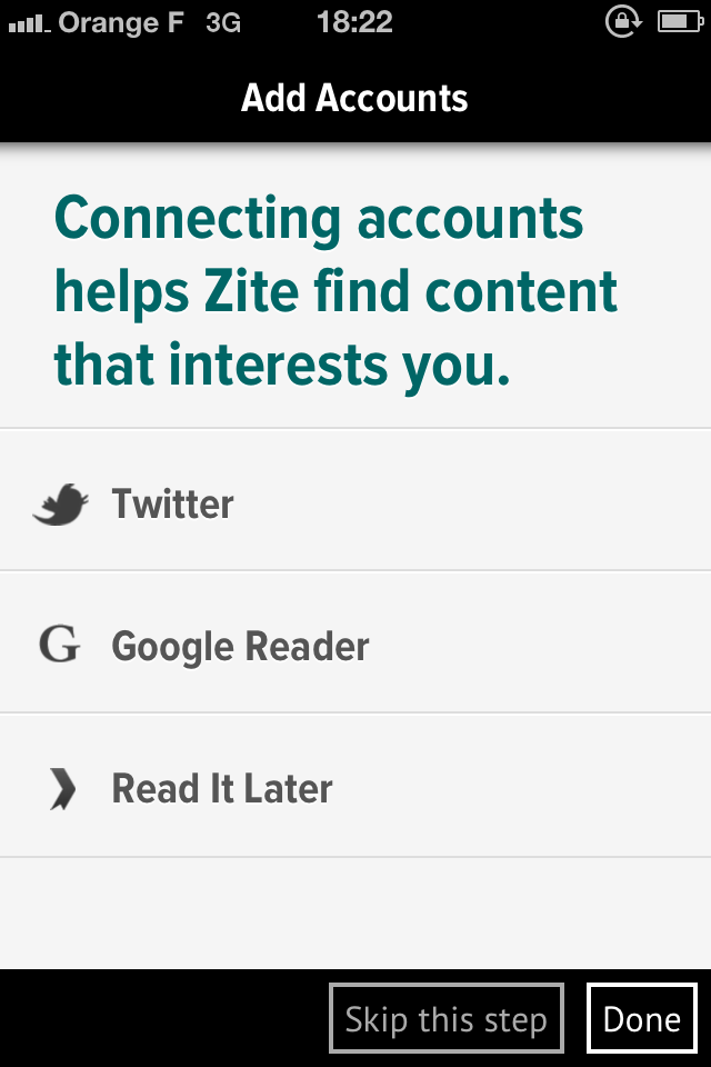 Pour commencer, Zite vous propose de lier certains de vos comptes sociaux pour adapter au mieux le contenu à votre profil. Bien sûr, cela n’est pas obligatoire et vous pouvez donc passer cette étape si vous le désirez.
