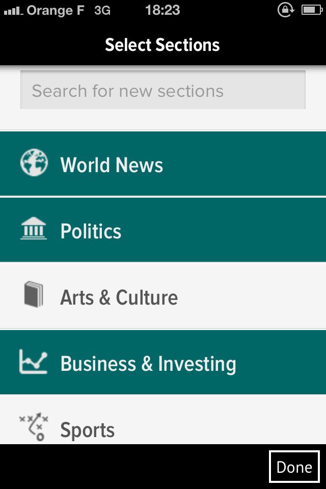 Une fois ces quelques informations renseignées, l’aventure commence. L’interface est assez originale. Vous pouvez naviguer dans les différentes sections (s’affichant en haut de l’écran) que vous suivez grâce à un glissement d’un côté à l’autre de l’écran. Le fil de la section choisie s’affiche alors, vous permettant de cliquer sur les articles qui vous intéressent. Ceux-ci s’affichent alors tels qu’ils apparaîtraient sur Safari (on regrette d’ailleurs un peu ce manque de mise en page de la part d’application), avec deux grosses icônes Like/Dislike vous permettant de dire si vous appréciez ou non cet article. En fonction de vos réponses, le contenu du fil s’adaptera à vos goûts, le rendant plus personnalisé.