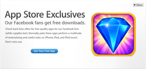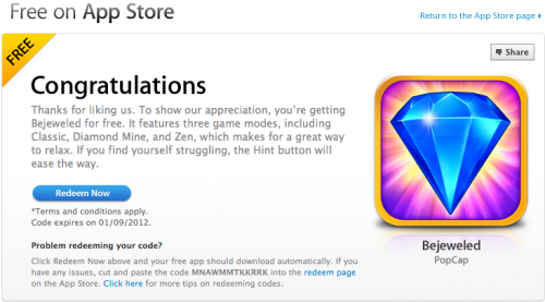Après JetPack Joyride et Jetez vous à l’eau, Apple vous offre un nouveau jeu via sa page Facebook FreeOnAppStore. Il s’agit du nouveau Bejeweled, Le numéro 1 des ventes aux États-unis depuis sa sortie il y a un mois. Le joyau de PopCap est le meilleur jeu de la catégorie Match-3, dont il est d’ailleurs l’instigateur…