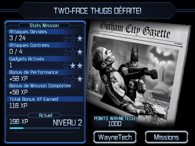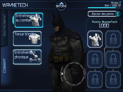En fonction de vos performances, des points Waynetech et des points d’expérience vous seront distribués. Ces premiers permettent d’acheter des nouveaux équipements ou d’améliorer les compétences de Batman.