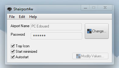 - Configurer Shairport4w : Extrayez l’archive et lancez l’exécutable. Cliquez ensuite sur « Change… » pour changer le nom qu’affichera votre PC et choisir un mot de passe.