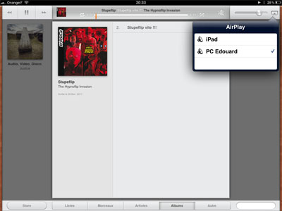 - Streamer : Il vous suffit maintenant de lancer la lecture d’un fichier audio depuis l’application iPod de votre iDevice ou depuis tout autre application compatible AirPlay. Ensuite, dans le menu dédié, votre PC apparaîtra comme une borne AirPlay et vous pourrez y diffuser l’audio de votre iDevice.